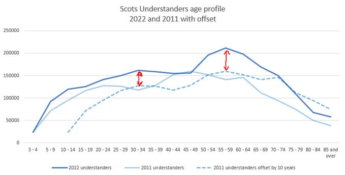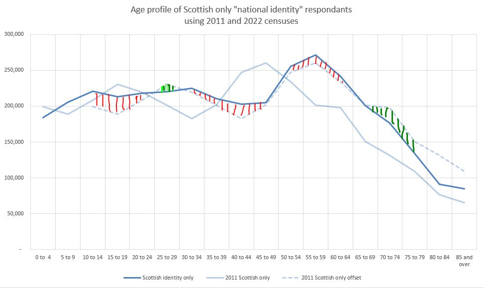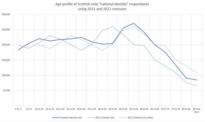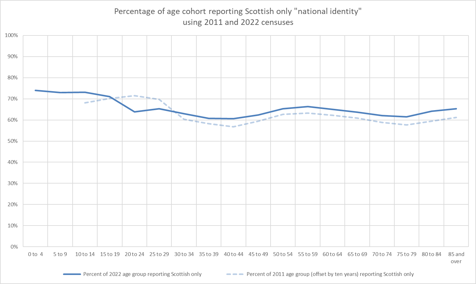 We can plot a similar graph of the age profiles of people who reported their Scottish only national identity, and it should reveal who changed their minds.