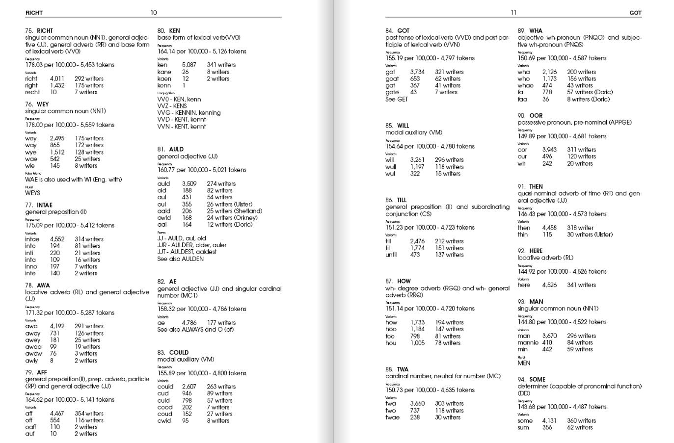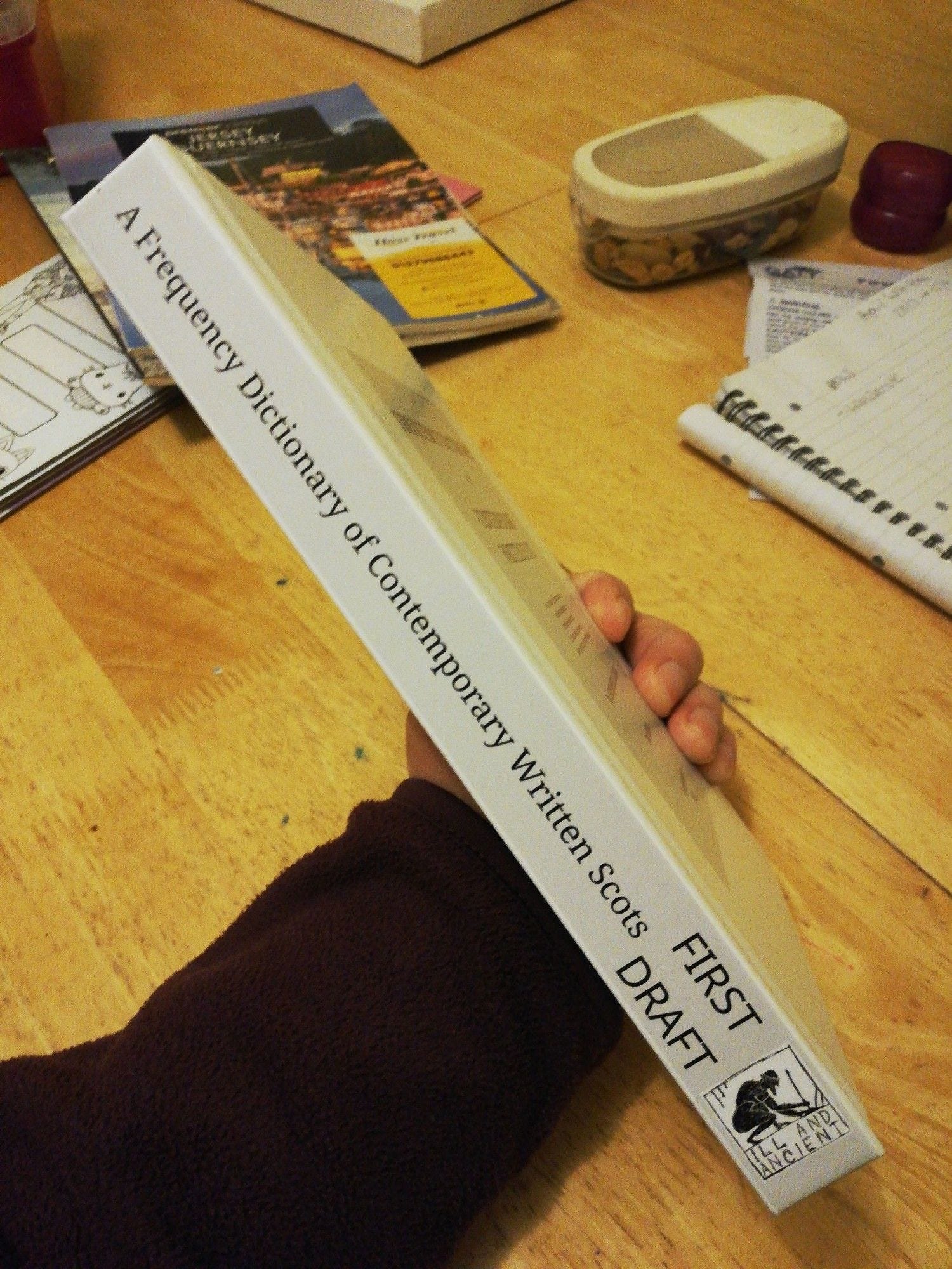 First, it is necessary to say that my general conclusion is that more people should buy the book I have somehow spent the last four years compiling, A Frequency Dictionary of Contemporary Written Scots. The 2,500 most common words listed in order of their usage, with spelling variants, for only £20 +postage via print on demand here.