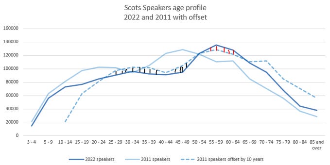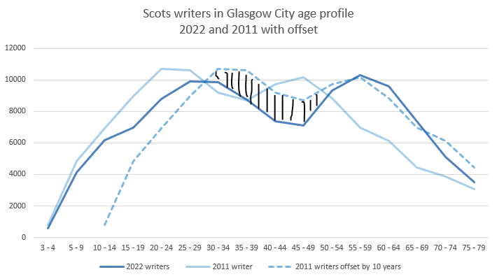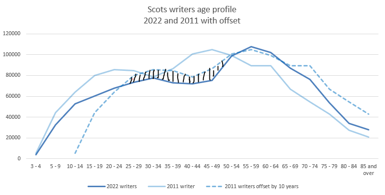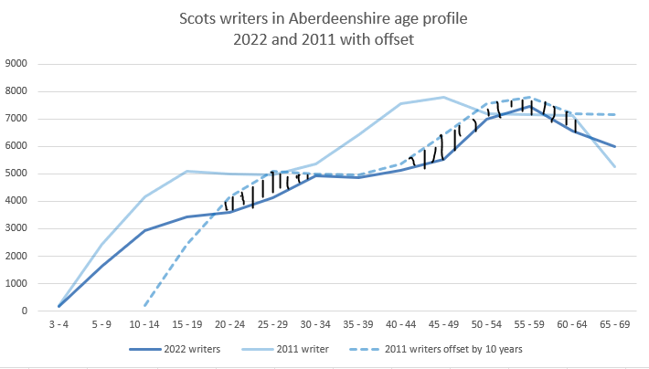 Here there is a big chunk of people between the ages of 24 and 54 who suddenly, over a ten year period, decided they no longer have the skills to write in Scots, and the number who changed their mind was about 49,000 people.