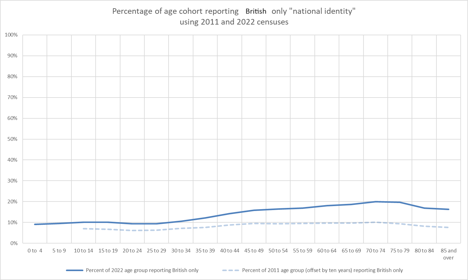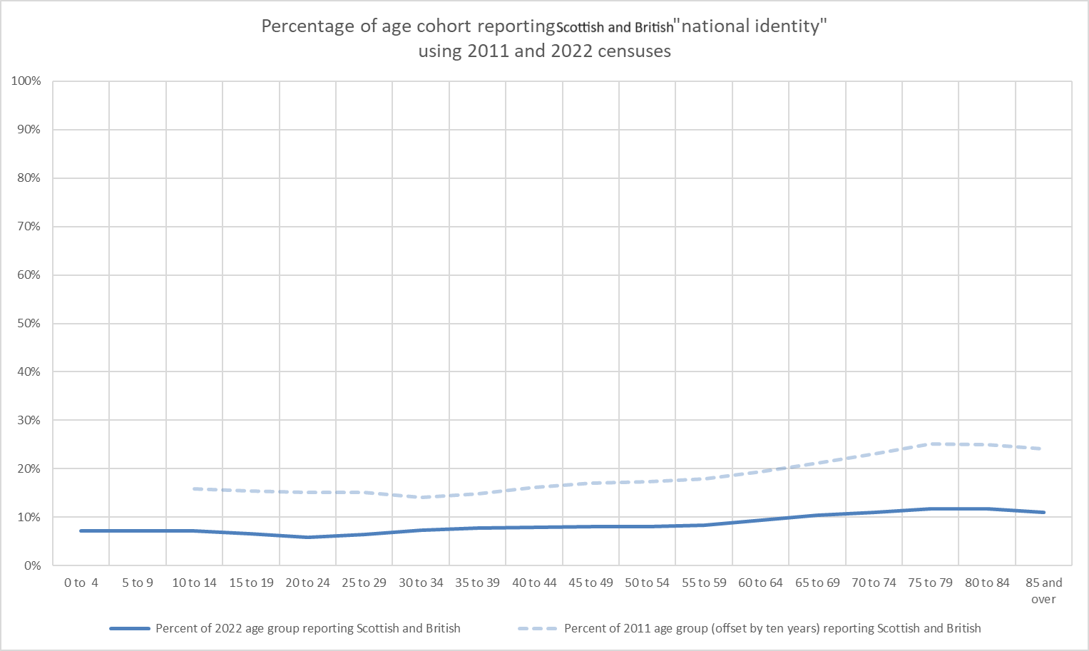 Although at this point I wish to concede that perhaps I should be looking at the percentage of each cohort, instead of just the number of people. So here is the graph of percents of each age group who reported a Scottish only national identity in the 2022 census, and in the 2011 census (offset by ten years).