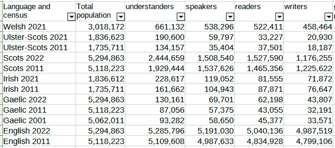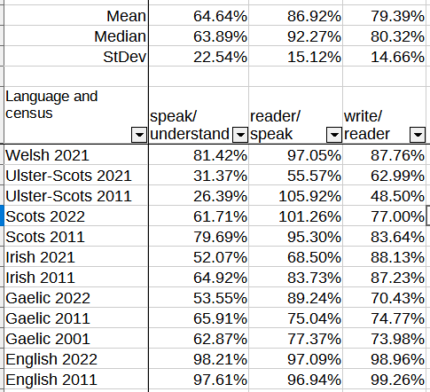 The only exceptions being Scots 2022 and Ulster-Scots 2011, in both cases there were more readers than speakers. Its weird, but not exceptional.