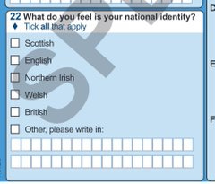 It lists the various nations of the UK, Scottish, English, Northern Irish, Welsh, British and “Other, please write in”, headed with the words “Tick all that apply”. This is effectively identical to the 2011 question, except back the it was “Tick ALL that apply”.
