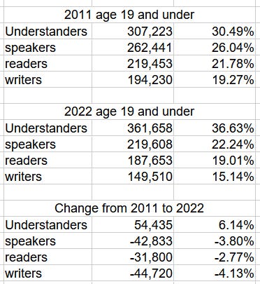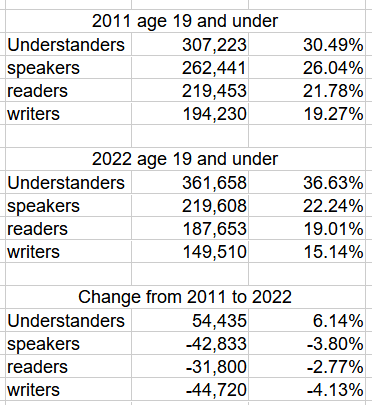 However we can see that the changes in the proportions of understanders, speakers, readers and writers have changed in much the same way as the rest of the population. Understanders have increased by 6.14%, speakers are down 3.8% and writers are down 4.13%.
