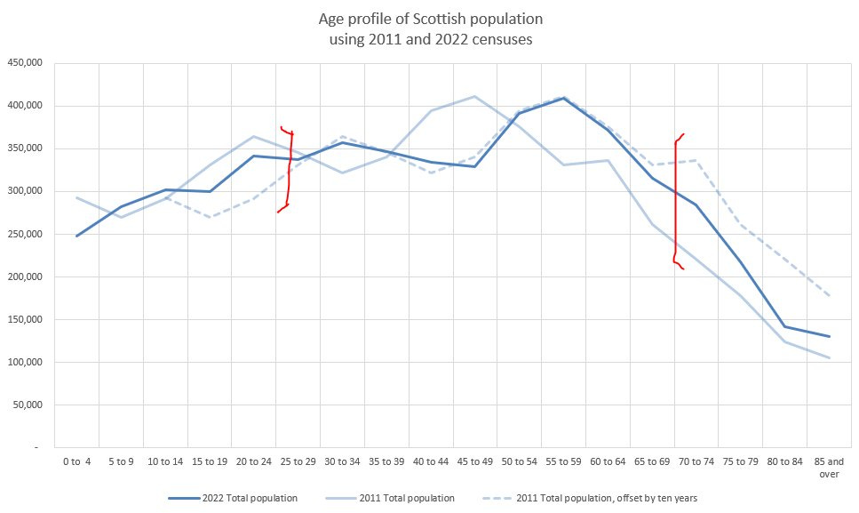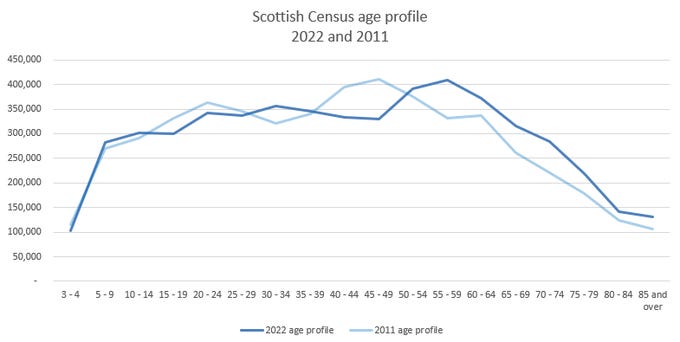 If we grab the census data for age groups, from 2011 and 2022 and plot a graph of the age profile, we can see that the line for 2022 (dark blue) looks a bit like the line for 2011 (in light blue) but shifted along ten years.