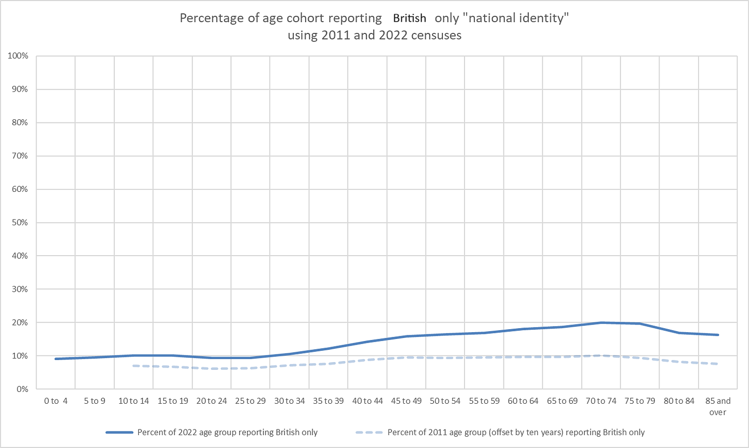 For British only we can see an increase across the whole range of age cohorts, steadily rising from a 3% increase for young people to a 10% increase for the older folk.