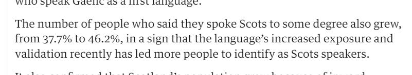 The Guardian didn’t pick up on the difference between “any skills in Scots” and “speaking” and reported that the number of speakers had increased specifically “spoke Scots to some degree also grew, from 37.7% to 46.2%”, when we know the number of speakers decreased.
