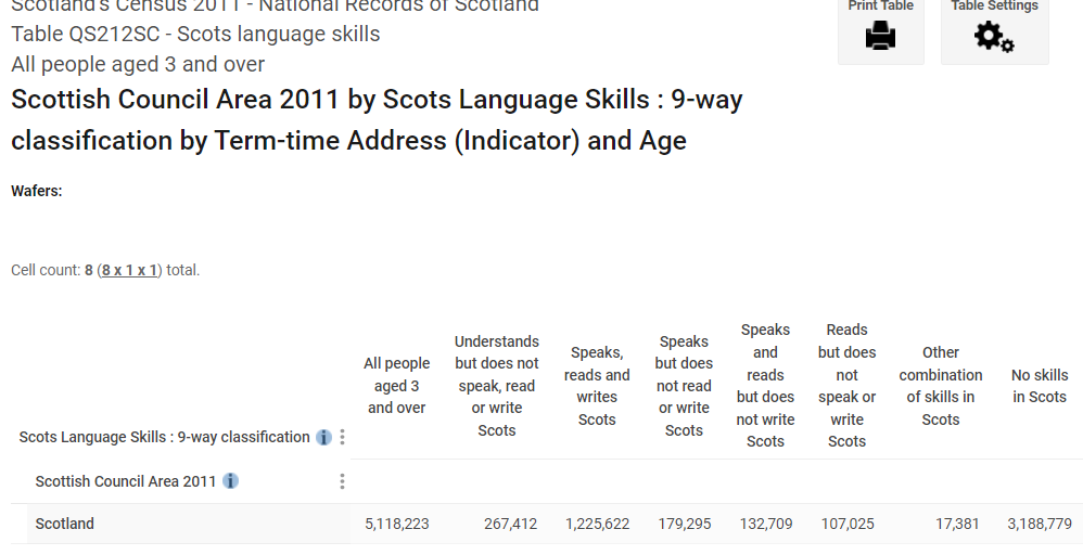 Absent from the Scottish Census press release, and the first round of press coverage was the actual numbers involved in the Scots language data.