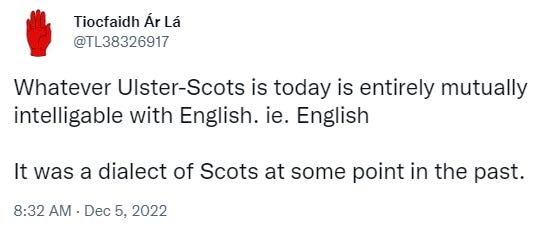 A few months back a person on Twitter brought up a variation the old trope that Scots used to be a different very language to English but now its really similar to English.