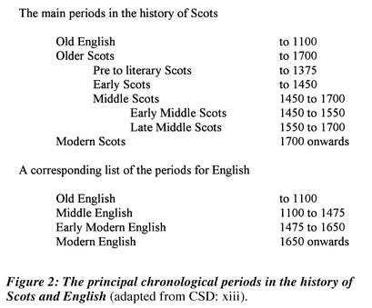 We might consider varieties of Scots to come in two dimensions, namely regional (Ulster-Scots, Central Scots, Doric, Southern, Orkney, and Shetlandic varieties) and temporal (Early Scots, Early Middle Scots, Late Middle Scots, Modern Scots). There would inevitably be a matrix here where each regional variety has a corresponding temporal variety, such as Early Doric Scots, or Late Middle Shetlandic, but we will tie ourselves in knots trying deal with each matrix variety separately.