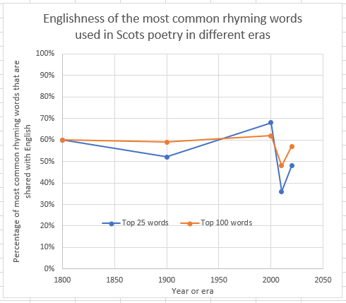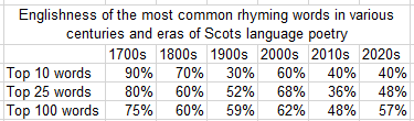 Over the past few months I’ve been compiling a Scots Language Rhyming Dictionary by going through all the Scots poetry I can get my hands on, and the rhyming words in in a big spreadsheet, with publishing date and author details. On my laptop this spreadsheet currently has about 20,000 rhyming word-pairs, spanning four centuries of Scots poetry and more than 300 different poets. Its reasonably balanced, no single poet makes up more than 1.3% of the total, its very over-weighted toward the 21st century, but there’s about 1,500 lines from each of the 18th, 19th and 20th centuries. Is that enough?