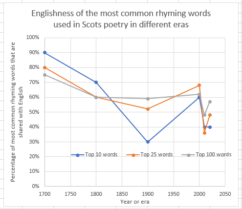 I reckon that framed like this, the Modern Scots language, as used by poets between 1800 and 2023 is stable and has a consistent level of similarity with English, with no drift away or closer.